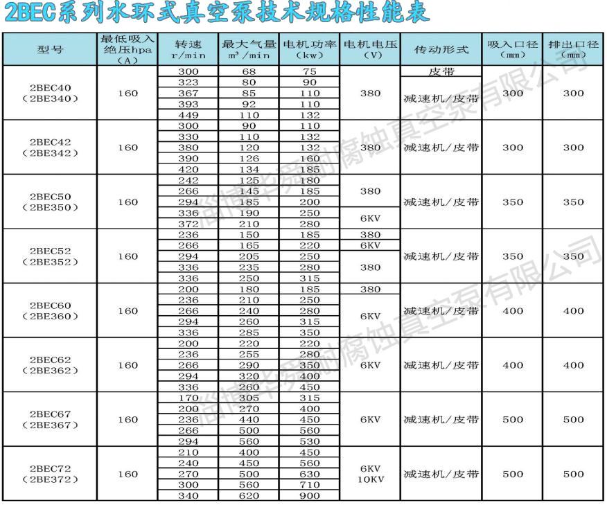 2BE系列水環真空系及壓縮機,是我公司在多年科研成果和生產經驗的基礎上,結合國際同類產品先進技術,研制開發的高效節能產品,通常用于抽吸不含固體顆粒,不溶于水,無腐蝕性的氣體,以便在密閉容器中形成真空和壓力。通過改變結構材料,亦可用于抽吸腐蝕氣體或腐蝕性液體做工作液。廣泛用于造紙、化工、石化、輕工、制藥、食品、冶金、建材、電韻、煤暖、金屬礦山、化等行業。本系列泵采用單級單作用的結構形式,具有結構簡單,維修方便,運行可,高效節能的優點,并能適應排水量大,載荷沖擊波動等惡劣工況。我們對關鍵部件,如分配板,葉輪和系軸進行了系列優化設計,簡化了結構,提高了性能,實現節能。采用球墨鑄鐵或焊接葉輪,葉片一次沖壓成形,型線合理:輪轂全部加工,從根本上解決了動平衡問題。葉輪與系軸采用熱裝過盈配合,性能可靠,運行平穩。葉輪焊接后,整體進行熱處理,使葉片具有良好的韌性,葉片的抗沖擊,抗折彎能力得以根本保證,能適應載荷沖擊波動等惡劣工況。2BE系列泵,自帶氣水分離器,多位置設有排氣口,泵設有排氣檢修口,葉輪與分配板間通過定位軸承兩娉壓益調整,安裝使用方便,操作簡單,便于維修。